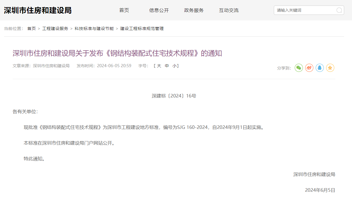2024年6月5日,由中國建研院深圳分公司參與主編的深圳市工程建設地方標準《鋼結構裝配式住宅技術規程》SJG160-2024正式發布,并將于2024年9月1日起正式實施。