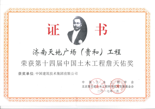414,第十四屆中國土木工程詹天佑獎頒獎大會在北京舉行。中技集團建筑設計院設計三所設計的濟南天地廣場(貴和)項目榮獲“第十四屆中國土木工程詹天佑獎”。